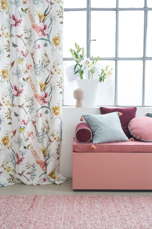 INDES: Colour Worlds – Junge Farbwelten mit Persönlichkeit Indes schafft Trends für junge, moderne Wohnstoffe – mit Farbe, Design und viel Persönlichkeit. Farbwelten wie Salsa Red, Black & Silver oder Spring geben mal kräftig, mal dezent den Ton an. Und schaffen perfekt aufeinander abgestimmte Wohlfühl-Atmosphären. Dabei setzt Indes auf klare Designs: Ausdrucksstarke Druckstoffe sind hier das Markenzeichen, sie harmonieren mit Ausbrennern, Scherlis oder gewebten Strukturen.
