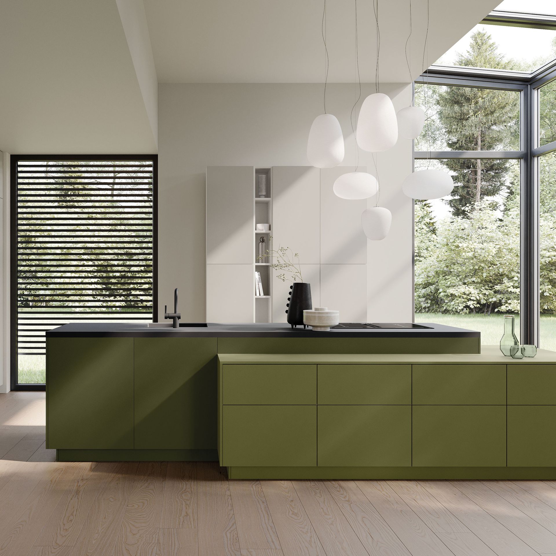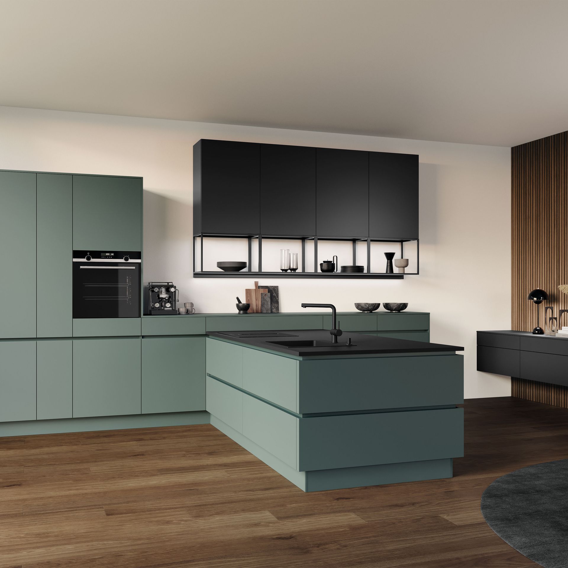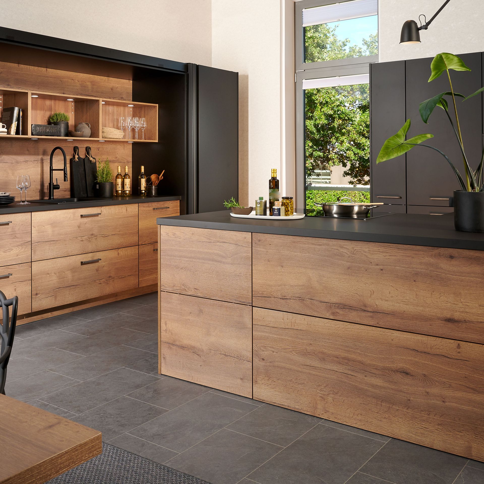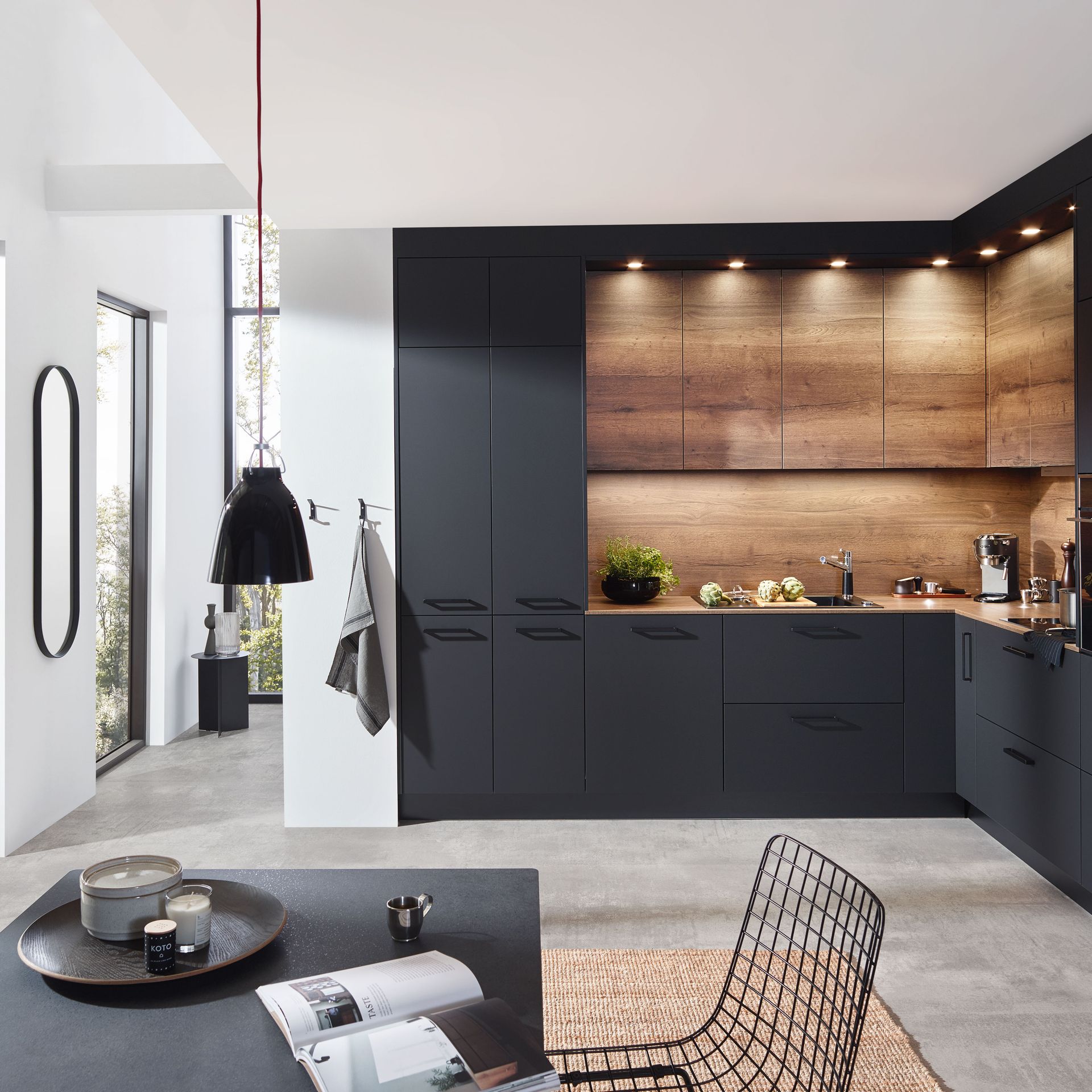 Wie sieht die Küche in den 2020-er Jahren aus? Eines ist klar: Sie ist offen für Neues. Offenes Wohnen ist so aktuell wie nie zuvor, und die einzelnen Lebensbereiche verschwimmen. In der Küche wird gearbeitet, gustiert und gekostet, auch gegessen, gechillt und verweilt. Das nicht mehr so wie vor einigen Jahren meist in klinischem Weiß, sondern in eher dunkleren Tönen. Dabei reicht der Bogen von Anthrazit über Mitternachtsblau und Tannengrün bis zu dunklen Hölzern, in die sich immer wieder ein neuer, leichter Rosé Ton mischt und für frischen Wind sorgt. Diese Farbwelt ist oft matt, in Anti-Fingerprint Optik, meist grifflos und mit vielen praktischen Details gespickt. Es gibt unzählige Varianten, um typische Küchenhelfer verschwinden zu lassen, die dann mit einem Handgriff sofort parat sind. Die Zeiten, in denen die Küche offensichtlich mit ihren technischen Hilfsmitteln geprahlt hat, sind Schnee von gestern. Alle Linien sind klar und puristisch. Die Küche beeindruckt als stylishes Designmöbel und Blickfang zugleich.
