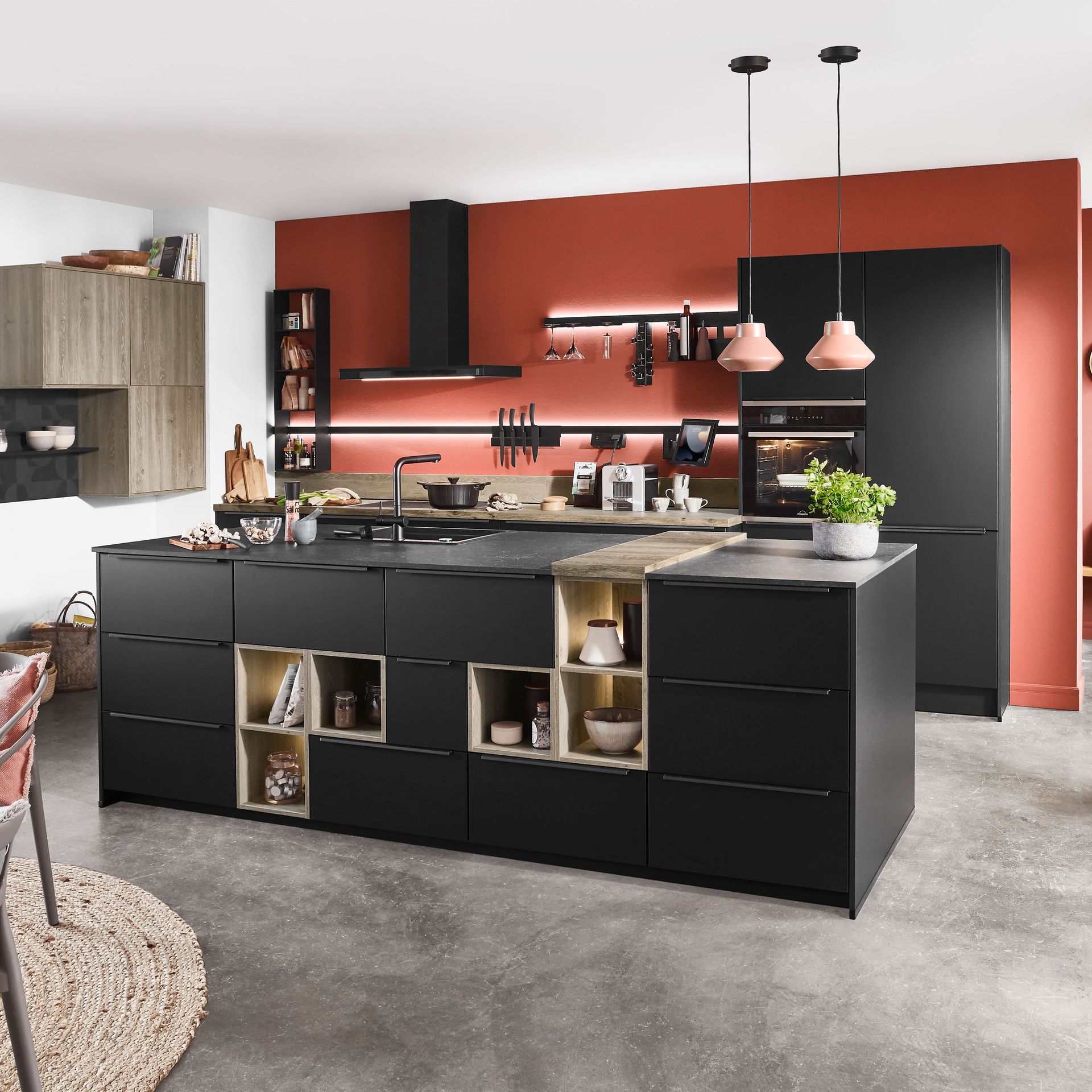Die Frische von Gemüse und Obst findet sich in zahlreichen Grüntönen wieder sowie in zahlreichen Elementen aus Flora und Fauna. Bei den persönlichen Gestaltungsideen sind der Fantasie keine Grenzen gesetzt. Individualität wird großgeschrieben, jeder kreiert sein eigenes Küchenkunstwerk. Aber so wie die Begeisterung für gute Weine immer mehr Liebhaber um sich schart, steigt auch der Mystik- und Glamourfaktor im Küchenstyling. Beton und Industrial-Design gesellen sich deshalb zu verspielten Elementen. Während der Purismus in der Linienführung für Bodenhaftung und klare Strukturen sorgt, gibt die farbliche Gestaltungsfreiheit Freiraum für eigene Kreativität.