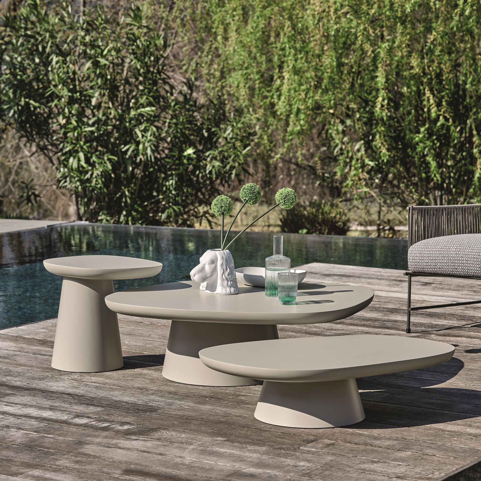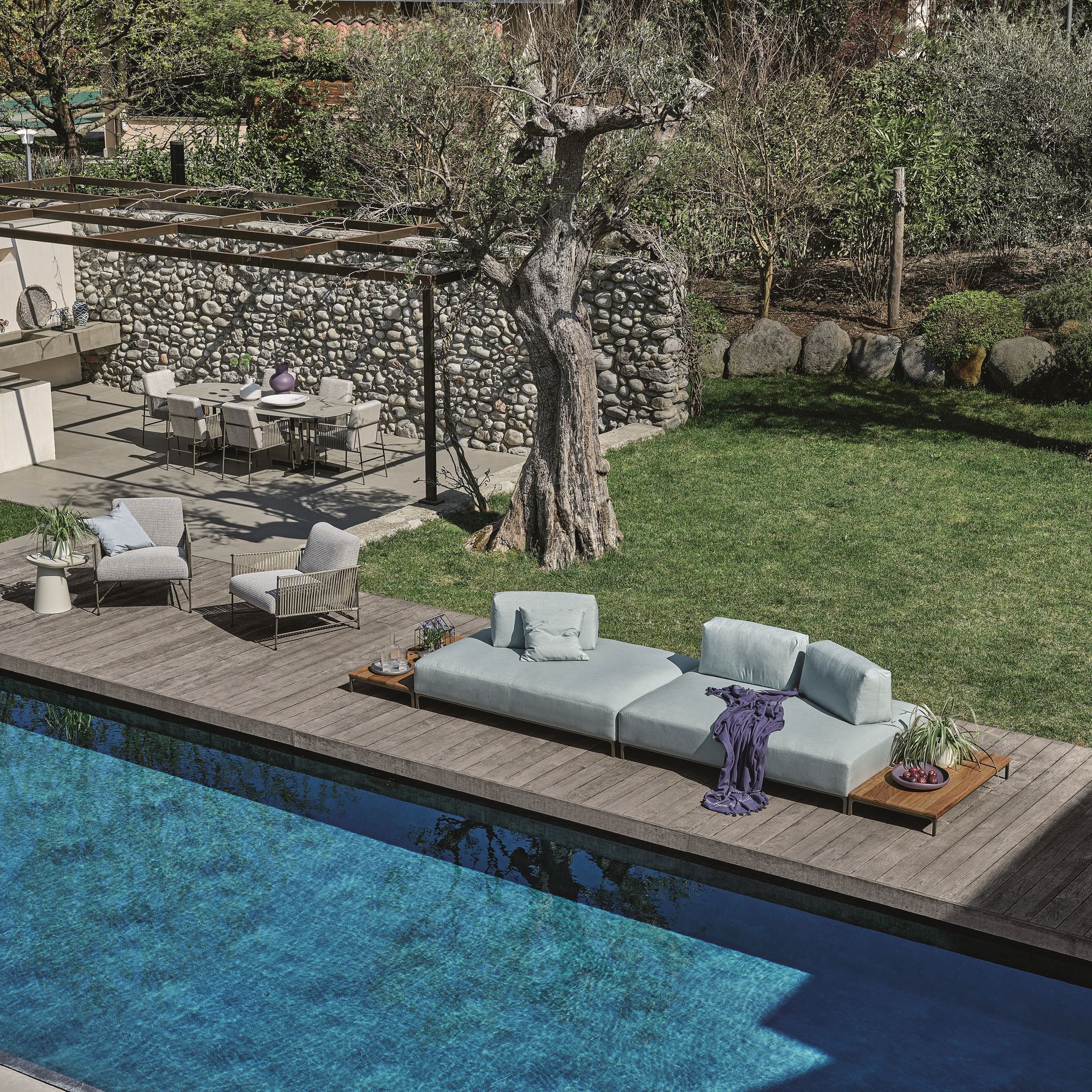 Der aktuelle Outdoor-Wohnstil spielt sich rund um natürliche Materialien ab. Echtheit, Nachhaltigkeit und Natürlichkeit stehen deshalb auch im Mittelunkt der Outdoor-Wohnkollektionen. Dazu passendes erdiges Beige, Braun und frisches Grün unterstützen diesen authentischen Stil. Doch nicht nur im Möbelsegment sind natürliche Materialien stark im Kommen: Ob Pflanztöpfe im rauen Natursteindesign, Teppiche in Jute-Optik oder Sonnenschirmständer in Holzoptik – die Natur findet sich auch mehr und mehr in Outdoor-Accessoires wieder.